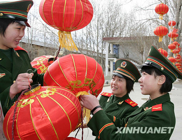 1月20日,武警西藏總隊通訊站的女戰士在營區掛紅燈籠。新華社發(趙艷志 攝)