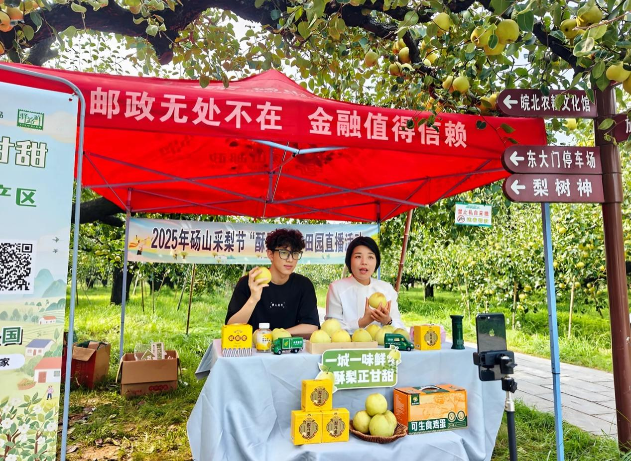 碭山郵政公司電商主播在梨園里直播銷售碭山酥梨(李艷龍 攝)