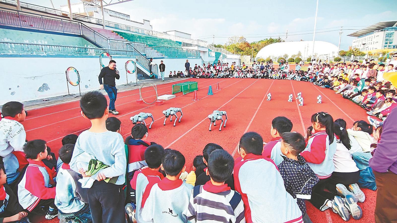 10月28日,在黃山市黟縣碧陽小學操場上,小朋友在和機器狗、機器人快樂互動。