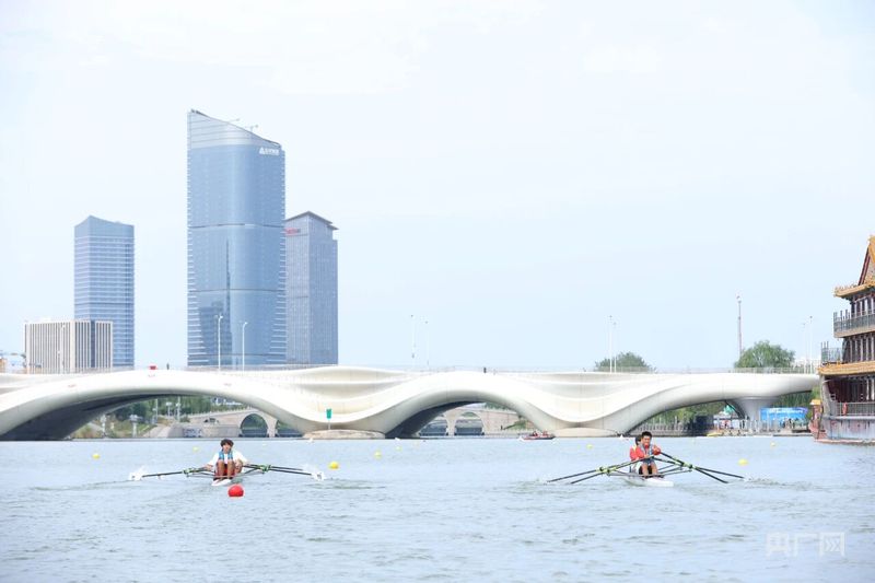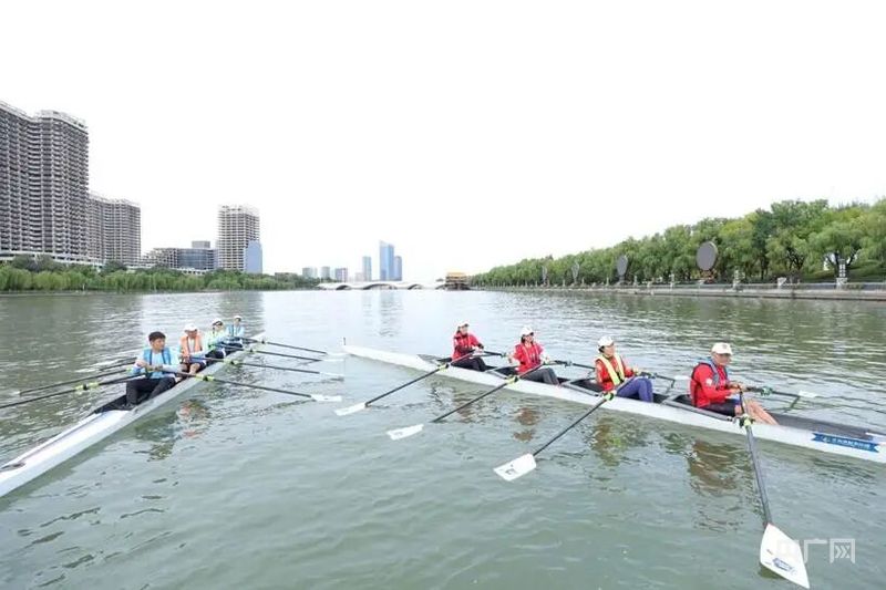 運河兩岸,運河商務區現代建筑群矗立,玻璃幕墻倒映河面波光與賽艇身影,傳統運河風光與現代商務景觀交融,成為賽事獨特的背景。隨著發令槍響,賽艇如離弦之箭沖出起點,選手們動作整齊劃一,每一次劃槳都強勁有力。濺起的晶瑩水花與他們矯健的身姿相互映襯,成為運河上一道亮麗的風景。