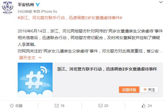 央廣網(wǎng)杭州6月16日消息(記者張國(guó)亮 李佳 河北臺(tái)記者白雪峰)據(jù)中國(guó)之聲《新聞縱橫》報(bào)道,孩子是父母的心頭肉,疼都來(lái)不及,然而,近日,一則“河北兩歲女童遭親生父親虐待”的消息,在微博平臺(tái)持續(xù)發(fā)酵。這條微博稱(chēng)“親生父親揚(yáng)言要打死女兒”,還附上了4張被打女童的照片,孩子身上多處布滿(mǎn)了淤青和血跡。發(fā)微博的人正是孩子的母親。14日下午,在河北、浙江兩地警方共同努力下,女童父親在杭州被警方控制。