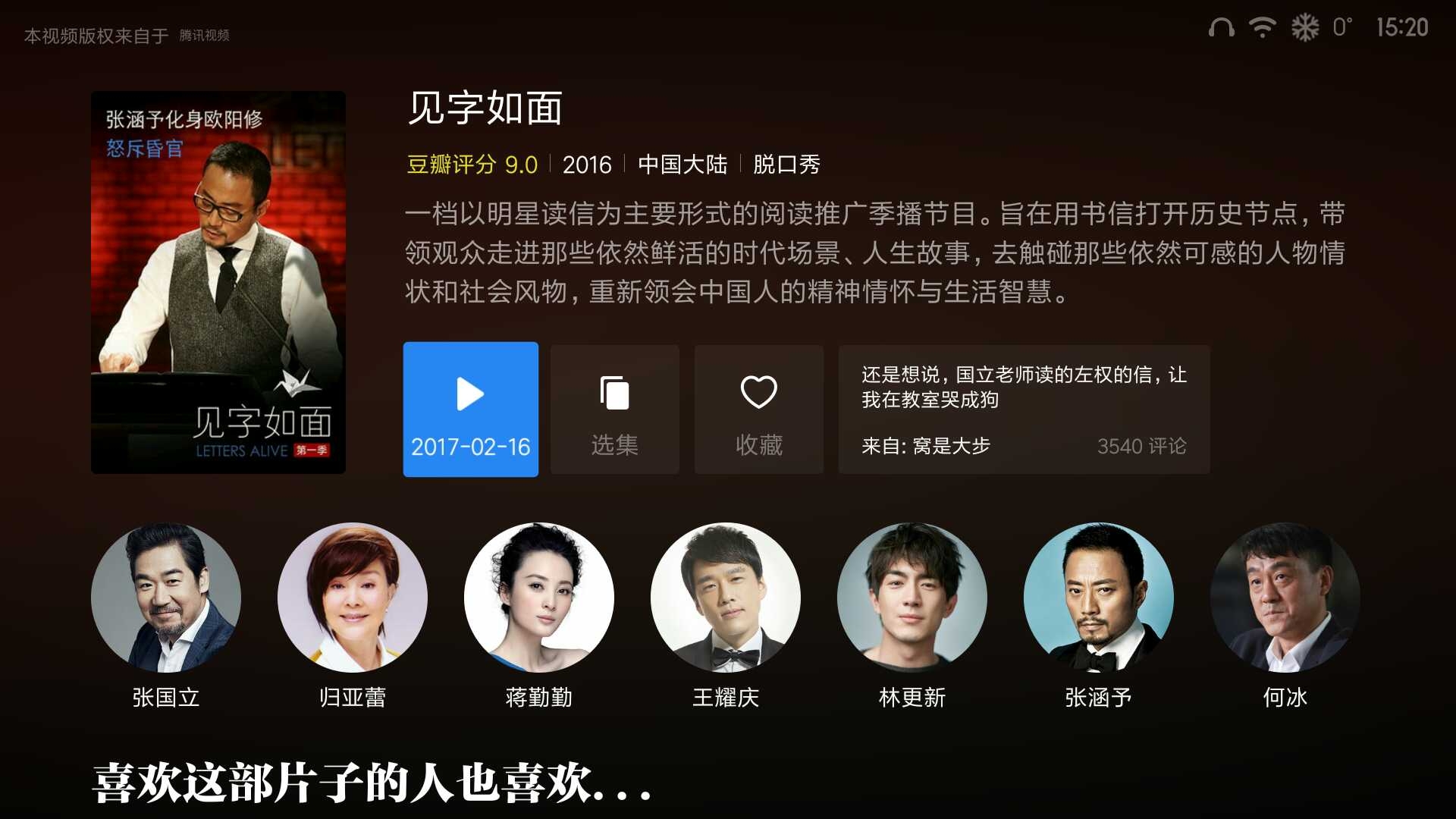 《見字如面》的節(jié)目形式,源于英國倫敦一個名為Letters Live的著名活動,從2013年開始每年一次,許多老戲骨在Freemasons' Hall 為觀眾讀各時代的信件,卷福就曾經(jīng)朗讀過二戰(zhàn)時期塵封的情書,這段視頻也流傳甚廣!兑娮秩缑妗访科谘埼鍌嘉賓,不說話,只念信。往期的嘉賓有張涵予、張國立、何冰、歸亞蕾、王耀慶、林更新、蔣勤勤等,不是金馬影后就是話劇臺柱子,個個都是實力派。信件本身也頗具來頭,歸亞蕾念的信,是好友蔡琴在丈夫楊德昌去世之后含淚寫下的《讓他活在我的歌里吧》。何冰演繹的,則是編劇蔡春豬寫給自閉癥兒子的一封信《那天,你被診斷為自閉癥》。隨著一封封信被緩緩讀出來,相信你一定會回到書信里的那段時光。