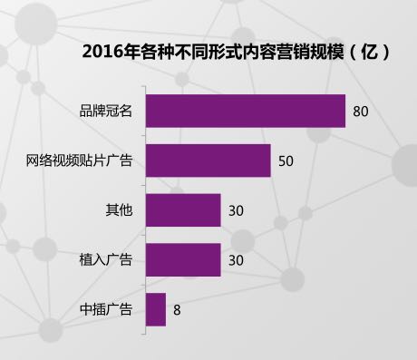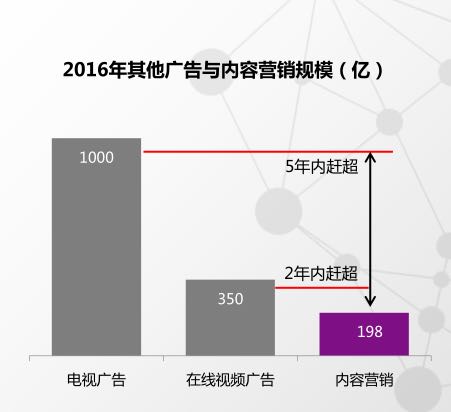 《娛樂內(nèi)容營(yíng)銷白皮書》指出,內(nèi)容營(yíng)銷規(guī)模在2016年已有近200億。“2016年在線視頻廣告的規(guī)模為350億,電視廣告規(guī)模則為1000億左右,內(nèi)容營(yíng)銷廣告在未來3-5年可能會(huì)超過電視廣告這樣一個(gè)量級(jí)和規(guī)模。”劉翠萍說。