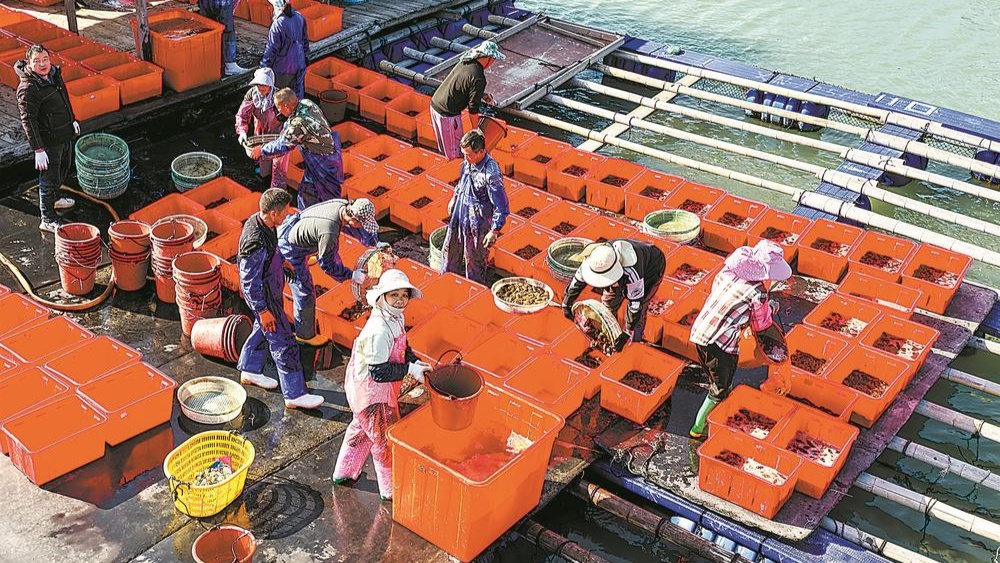 11月25日,在寧德市霞浦縣溪南鎮海域的漁排上,養殖戶將從育苗廠轉運至海上的海參苗小心投放入水。