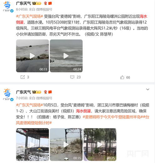 央廣網廣州10月5日消息(記者鄭少純)中央氣象臺監測顯示,今年第21號臺風“麥德姆”的中心已于10月5日14時50分前后在廣東省湛江市徐聞縣東部沿海登陸,登陸時中心附近最大風力有14級(42米/秒,強臺風級),中心最低氣壓965百帕。據“廣東天氣”微博消息,受其影響,廣東湛江吳川市覃巴鎮梅樓村、大山江街道良美村和廣東陽江海陵島螺洲公園附近出現海水倒灌。