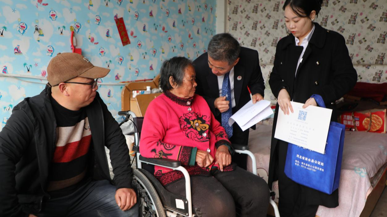 近日,河北保定淶水縣司法局公證處工作人員走進義安鎮寺皇甫村,為行動不便的老人提供上門公證服務,辦理委托公證手續。
