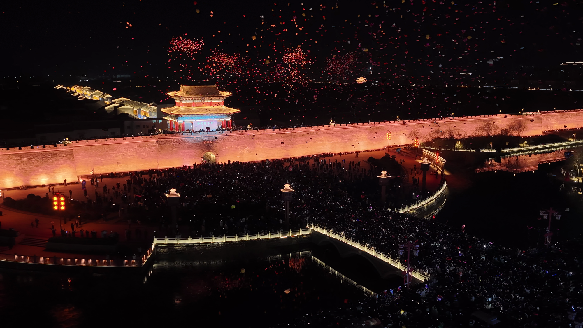 隨著零時臨近,古城北城門、宋街石刻博物館兩地同步開啟新年倒計時活動,萬人同時放飛氣球,流光溢彩的“鳳凰”盤旋天幕,光影在水幕間鋪展成絢麗畫卷,定格下辭舊迎新的精彩瞬間。