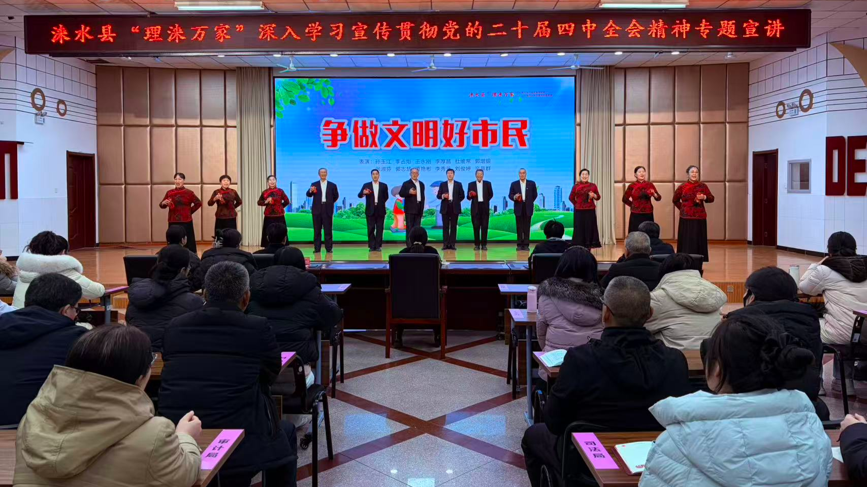 宣講活動在莊嚴的國歌聲中拉開帷幕。現場環節設計注重互動性與感染力,理論宣講與文藝節目交替呈現、相輔相成。《富位村那些事兒》《黨建紅引領菇香遠》等理論宣講節目,立足本地實際,通過“身邊人講身邊事”,生動展現了淶水縣在鄉村振興、基層治理等方面的實踐探索,彰顯了黨員干部在鄉村振興一線的使命擔當;《與你在一起》《不忘初心》等文藝宣講作品,則借助歌曲、群口快板、情景表演等藝術形式,將理論要義融入鮮活表演,讓觀眾在欣賞中接受教育、在共鳴中感悟思想。