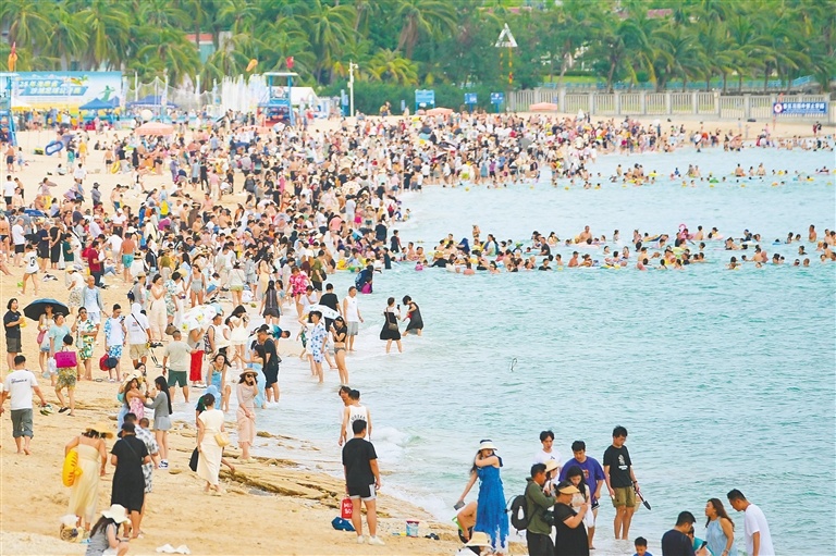 近日,在三亞大東海旅游區,眾多國內外游客前來游玩度假,在碧海藍天間樂享愜意假期。記者 王程龍 攝