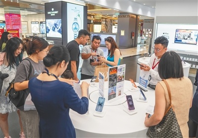 10月8日,在海口日月廣場的海控全球精品免稅城,不少消費者選購免稅品。今年國慶中秋假期,海南離島免稅經營主體通過拓寬消費場景、推出促銷活動等方式,持續釋放消費活力。李天平 攝