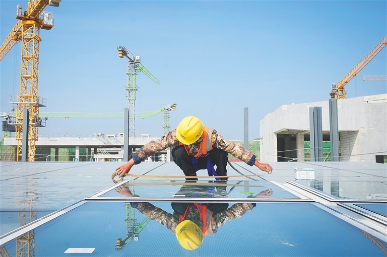 近日,三亞國際免稅城三期項目實現全面封頂。該項目總建筑面積約41.27萬平方米,總投資額達70億元,計劃今年起分階段落成,進一步完善我省免稅購物商業布局,豐富旅游消費供給。圖為工人在安裝天窗。(圖/記者王程龍 文/記者李艷玫)