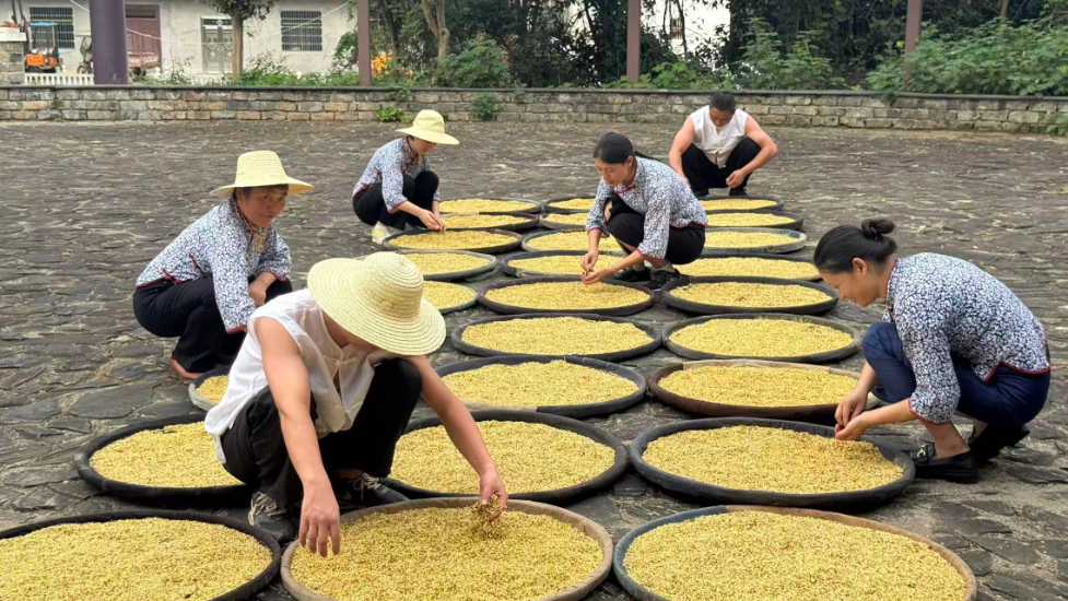 咸安桂花鎮S206省道旁的一公里街道上,更是一派繁忙景象。10多家收花商一字排開,滿身沾著桂花粒的花農們排起長隊,等著將新鮮桂花過稱變現。收花點里,有的老板現場用鹽腌制桂花,有的直接烘干處理,還有的將桂花裝車,送往紅牛、金桂生物等企業。據了解,各收花點每天收花量達萬斤。
