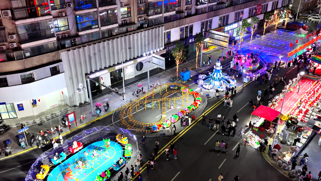 10月5日晚,中央金街的熱鬧氛圍愈發濃厚。燈火闌珊下,市民們或悠閑漫步,或駐足欣賞舞臺表演,游樂區笑語不斷,美食街煙火升騰。