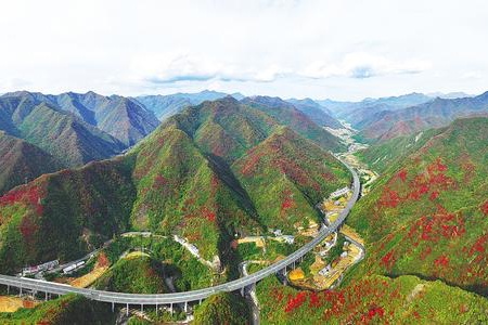 11月2日,竹山縣雙臺鄉五彩斑斕,G242國道與十巫(十堰-巫溪)高速公路如兩條絲帶穿行于層林盡染的連綿群山。