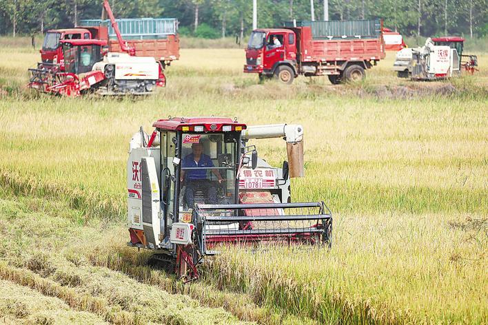 10月5日,咸寧市咸安區(qū)向陽湖現(xiàn)代農(nóng)業(yè)科技示范園高標(biāo)準(zhǔn)農(nóng)田的6000畝水稻迎來豐收季,農(nóng)機(jī)手們搶抓國慶長假期間晴好天氣收割水稻,確保糧食顆粒歸倉,田間地頭一片繁忙的豐收景象。 (視界網(wǎng) 吳濤 攝)