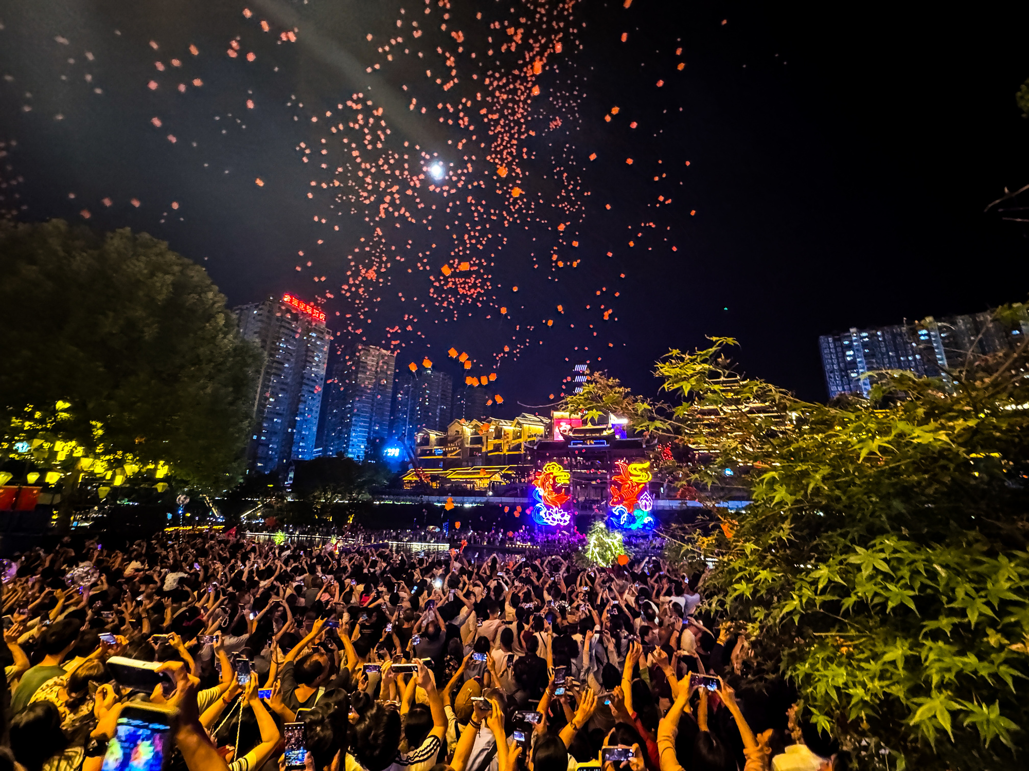 中秋夜晚,宣恩游客共放電子孔明燈(央廣網發 湖北省文旅廳供圖)