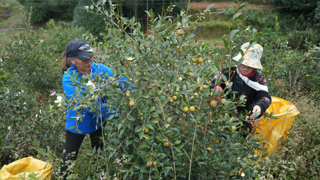 農(nóng)戶們搶抓時節(jié)采收油茶,繪就一幅生動的豐收圖景。