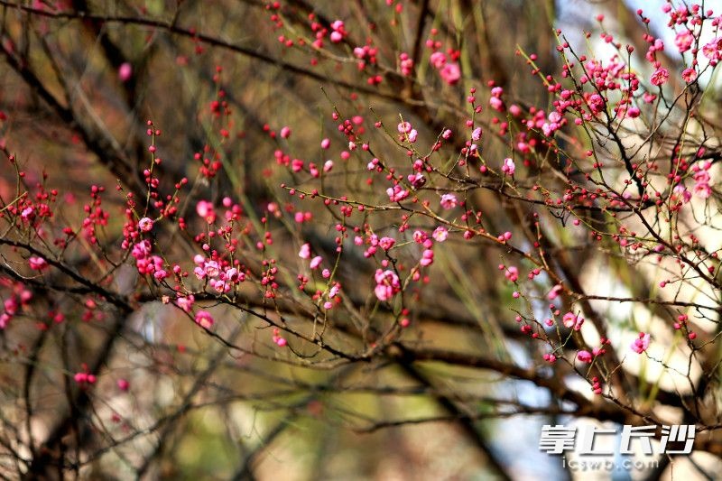 1月8日,湖南烈士公園年嘉湖畔,一抹抹嫣紅悄然綴滿枝頭,近兩百株紅梅迎著清風次第綻放,為冬日的長沙增添了靈動生機,也拉開了星城賞梅的序幕。
