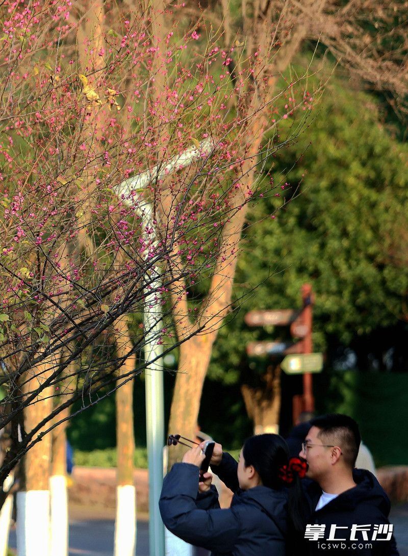 記者在現場看到,有的花朵傲然怒放,盡顯熱烈奔放;有的半開半合,恰似含羞佳人;還有的花苞緊裹,飽含生機與希望,構成一幅層次豐富的冬日“梅”景圖。湖水澄澈如鏡,倒映著嫣紅的花影與蒼勁的枝干,與岸邊的水生植物相映成趣,引得市民駐足觀賞打卡。