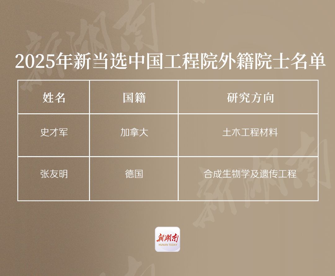 此外,湖南大學(xué)土木工程學(xué)院教授、博士研究生導(dǎo)師史才軍,岳麓山實(shí)驗(yàn)室研究員、湖南農(nóng)業(yè)大學(xué)兼職教授、湖南文理學(xué)院合成生物產(chǎn)業(yè)學(xué)院名譽(yù)院長張友明當(dāng)選中國工程院外籍院士。