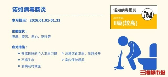 據介紹,本月湖南需重點關注諾如病毒腸炎與流行性感冒等急性呼吸道傳染病,其中諾如病毒感染風險尤為突出。隨著寒冷季節持續,湖南疾控提醒公眾需強化個人衛生,注意飲食安全,并做好疫苗接種等綜合防護措施,以應對冬季高發的腸道與呼吸道疾病風險。