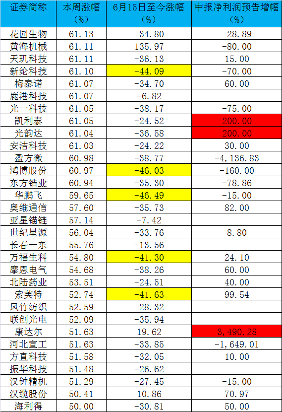 統計數據顯示,本周A股共2058只個股上漲,169只個股超過30%,漲幅超過20%的個股也有400只。剔除年內上市的公司,部分本周漲幅靠前個股跌幅仍較大,后市值得重點關注。