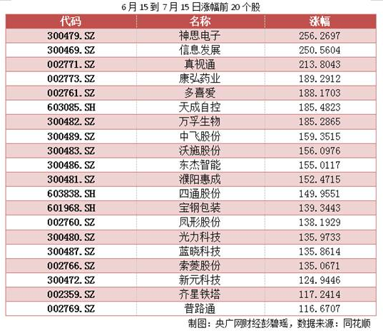 據同花順數據顯示,此時間段上漲幅度最高的個股為神思電子(300479.SZ),漲幅達256.27%,而上漲前二十名的個股,漲幅都超過了115%。