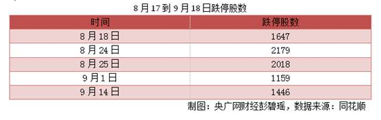 2015年8月17日至9月18日,大盤再度經歷一輪調整,一度觸及2850年內最低點。個股方面亦經歷了五次“千股跌停”。據同花順數據顯示,此時間段內,僅有47只個股整體呈上漲態勢,而漲幅也要比上次大盤調整期收窄很多。