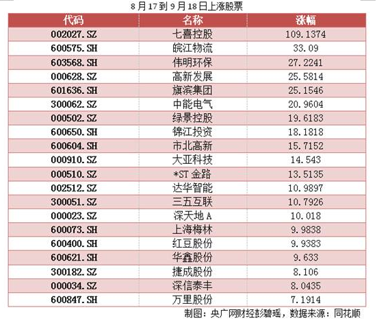 據央廣網財經記者統計,在47只上漲的個股中,上漲最多的個股為七喜控股,漲幅為109.14%,漲幅超過10%的個股僅有14只,居于第20位的萬里股份漲幅只有7.19%。