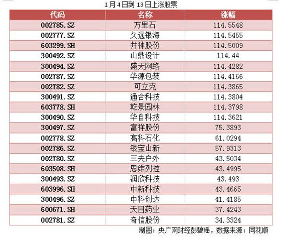 據同花順數據顯示,1月4日至13日期間,仍有64只個股整體呈上漲態勢。10只個股連續漲停。