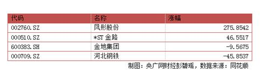 6月15日至12月31日,在此四只個股中,除河北鋼鐵漲跌幅與大盤幾近持平外,另外三只個股表現遠超大盤走勢,其中鳳形股份漲幅為275.85%,漲幅居四只個股首位,*st金路漲幅也達到了46.55%。