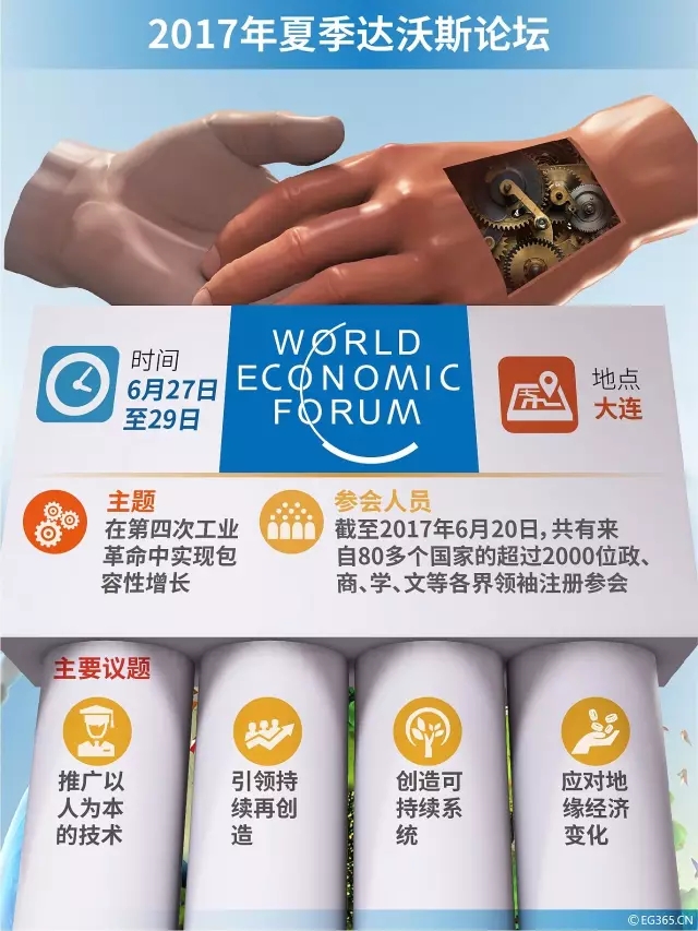 本次會議主題為“在第四次工業革命中實現包容性增長”。在為期3天的年會中,來自全球80多個國家的2000多位嘉賓將圍繞推廣以人為本的技術、引領持續再創造、創造可持續系統、應對地緣經濟變化等四個議題展開200多場會議討論,為世界經濟實現可持續發展提出具有啟發性的建議。