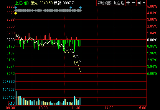 截止午盤,滬指報3097.71點,跌102.52點,跌幅3.20%;深成指報9994.34點,下跌469.35點,跌幅4.49%;創業板報1937.28點,下跌123.22點,跌幅5.98%。