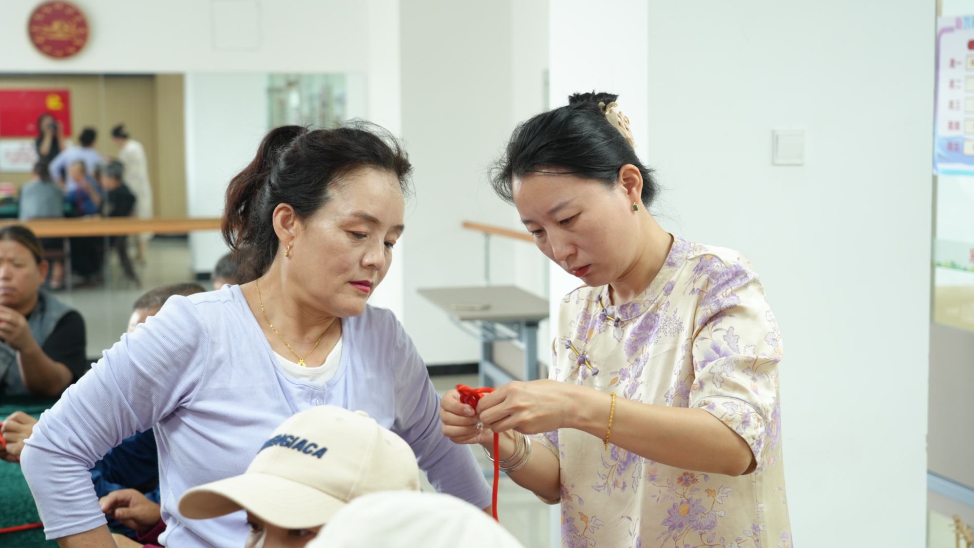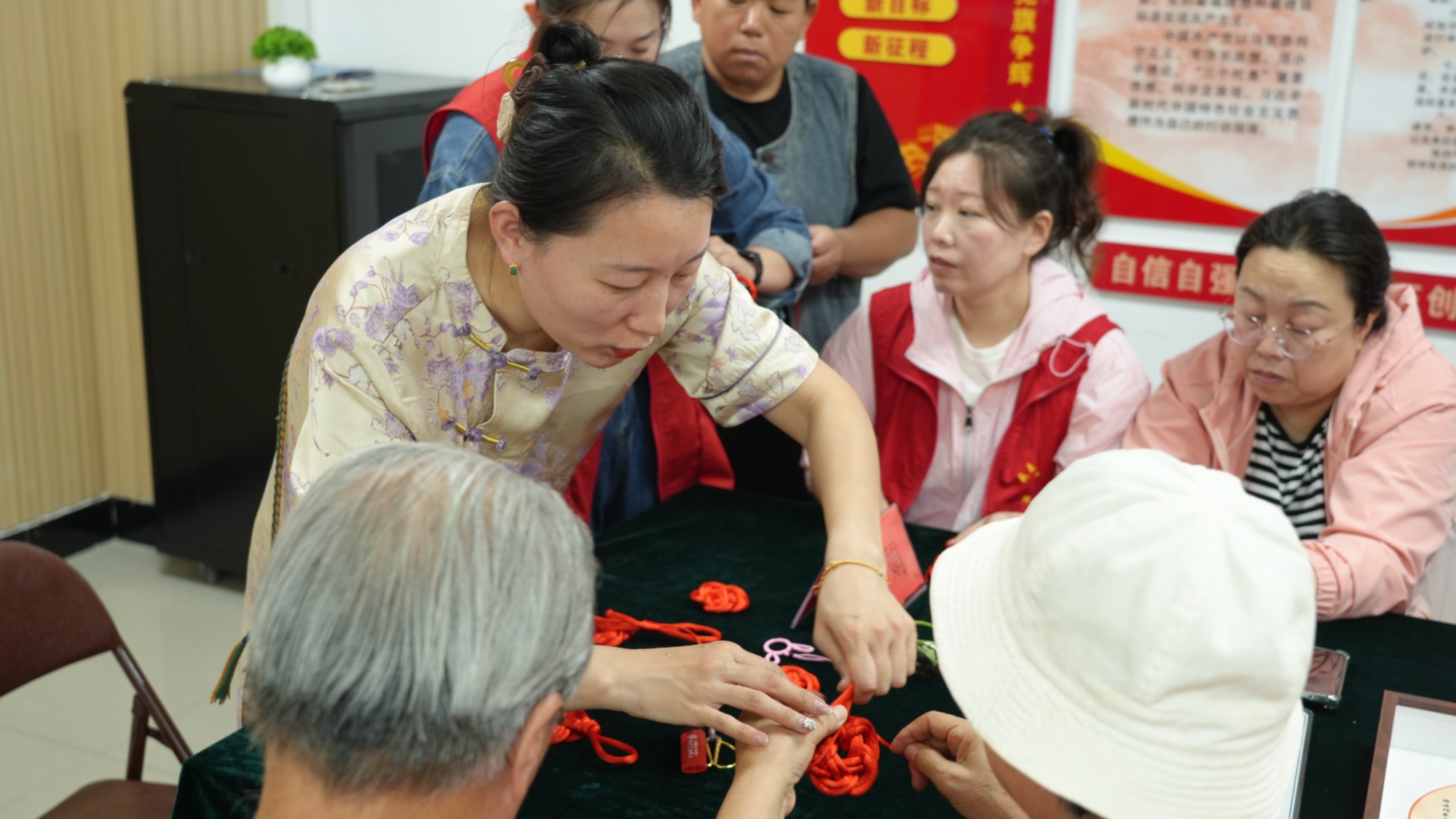 活動現場洋溢著溫馨與喜慶的氣氛。郝娟首先向大家介紹了所教授編織技藝的歷史淵源與文化內涵,展示了其精湛的作品,精美的圖案和巧妙的構思瞬間激發了大家的濃厚興趣。在隨后的教學環節中,郝娟還耐心細致地講解了基礎編織技法、步驟要領和注意事項,并進行了手把手地示范指導。