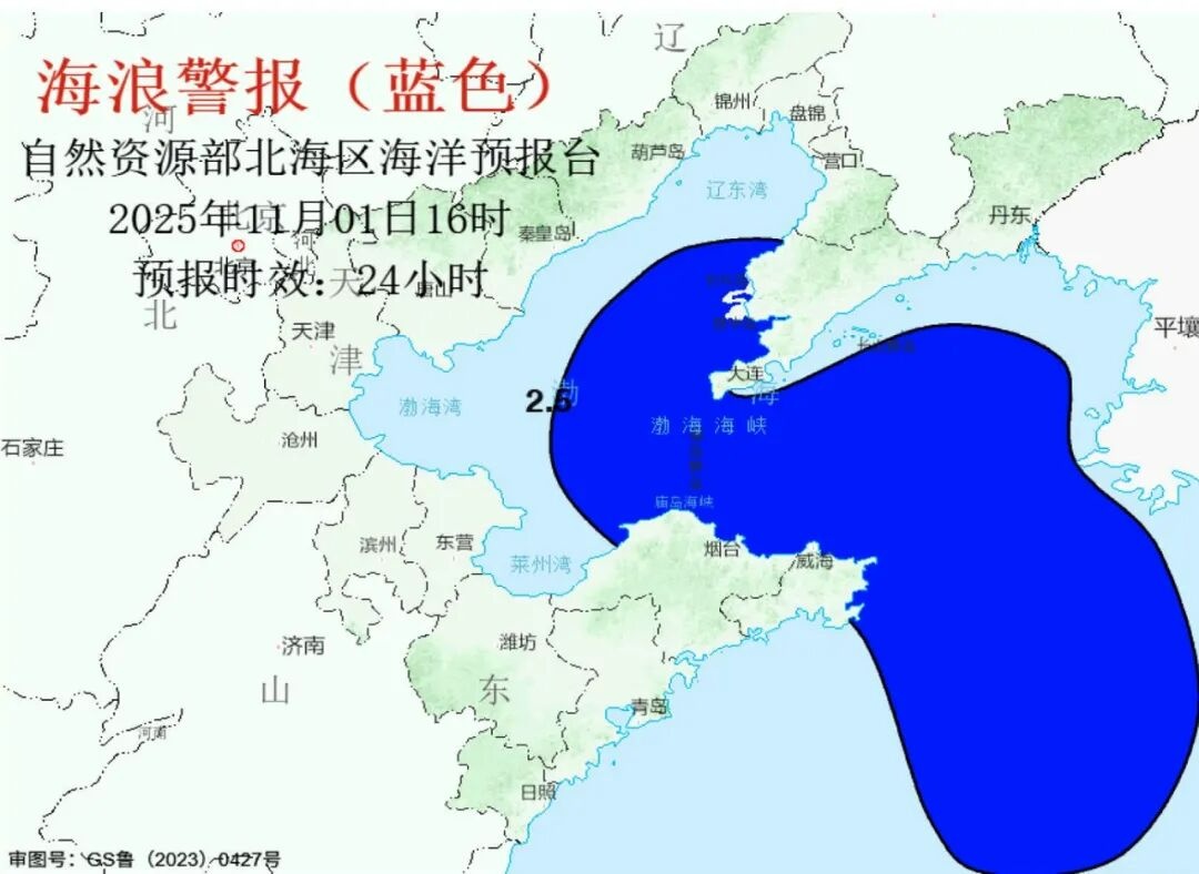 預(yù)計1日夜間到2日白天,渤海和黃海北部將出現(xiàn)2.5到3.5米的大浪區(qū)。