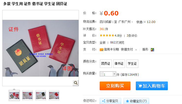 搞笑證件是近年來網絡惡搞文化催生出的一種產物,如"美女證","光棍證","忽悠證"等,在年輕人中很受歡迎,通常用來作為朋友之間開玩笑,或者送人的小禮物。這些搞笑證件除了在一些創意禮品店里可以買到之外,在網上也有不少兜售的賣家。然而,實際上,這些網店,只是掛著"搞笑證件"的招牌,實際上賣的就是假證。而淘寶客服對此表示他們也無能為力。 >>詳細
