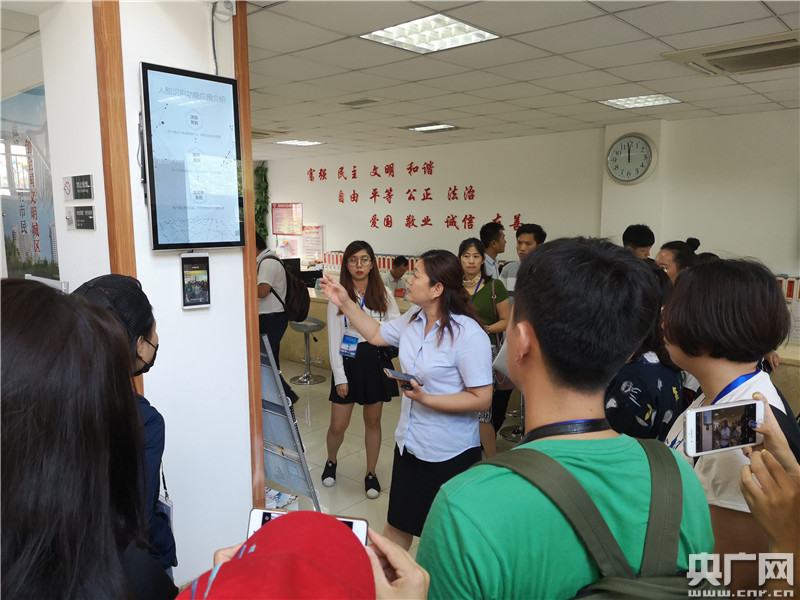 華納社區黨委書記劉紅霞向記者介紹人臉識別系統,居民可通過“刷臉”參加社區活動簽到、預約社區活動場地,實現免證件辦理等業務。(央廣網記者 梁爽 攝)