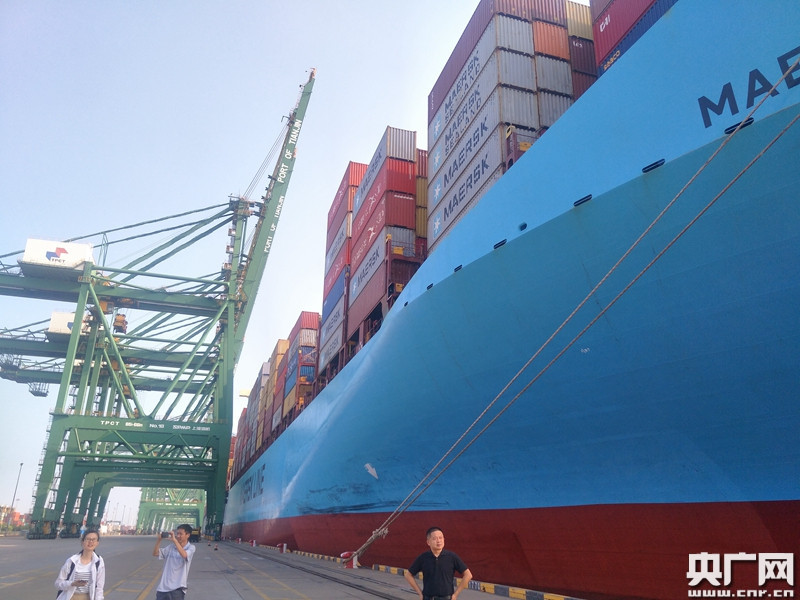 一輛輛集裝箱卡車魚貫穿梭在碼頭與堆場之間,將大批進出口貨物送到整裝待發的國際集裝箱巨輪前。(央廣網記者 王晶 攝)