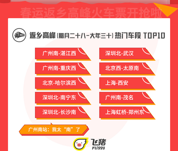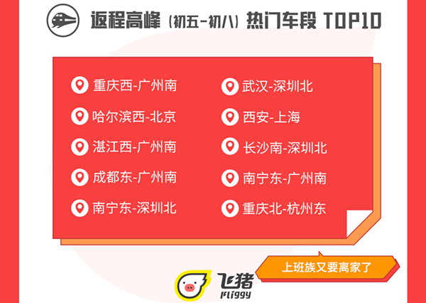值得注意的是,廣州南站春運高峰客流量最高,成為最繁忙的火車站,占據了TOP10中的三個車段:廣州南-湛江西,廣州南-重慶西,廣州南-茂名。另外,根據飛豬平臺火車票預約情況,春運回程高峰將出現在大年初五至初八,選擇初六返程的人最多。春運回程高峰期間,熱門車段TOP10的到達站同樣被北、上、廣、深四城“包場”,其中廣州南站獨占4席。