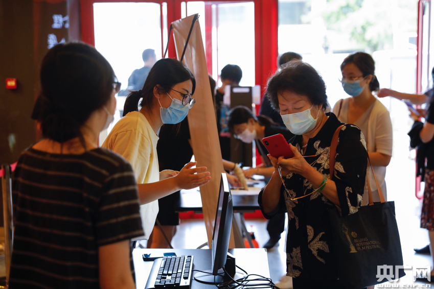 工作人員幫助觀眾進行“北京健康寶”登記操作(央廣網(wǎng)記者張凱航 攝)
