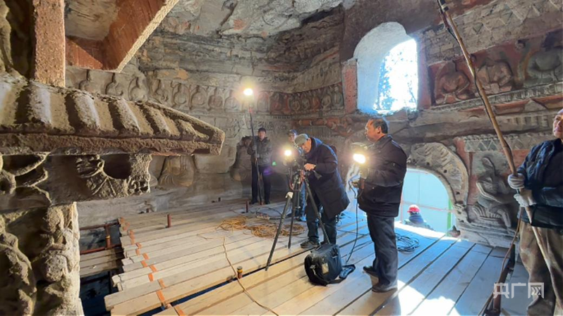 文保人員在洞窟里對造像進行拍攝存檔(央廣網記者 張晉鵬 攝)