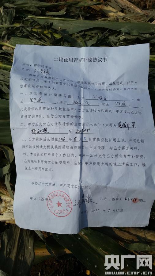 2015年7月劉維杰與村里簽了補償協議書,才終于把2013年桃樹被毀的賠償款拿到手。(央廣網記者 劉穎超 攝)