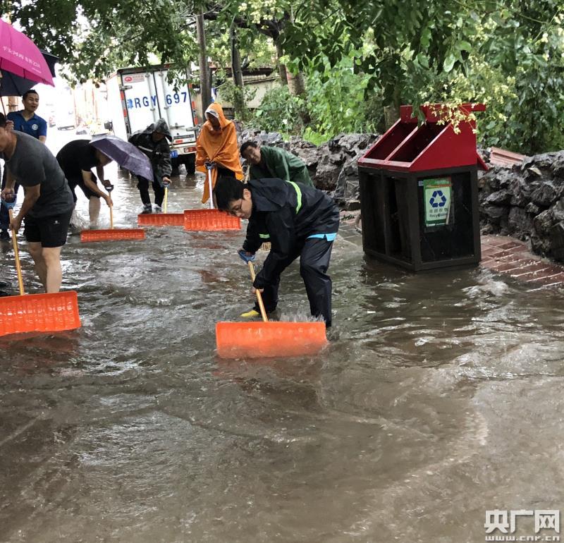 河西區陳塘莊街社區黨員干部在微山西里社區幫助居民人工排水。(央廣網發 李軒攝)