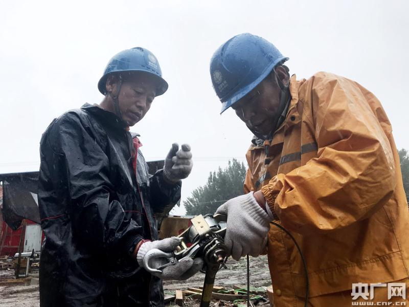 國網天津寶坻公司員工冒雨開展故障搶修。(央廣網發 李博雯 攝)