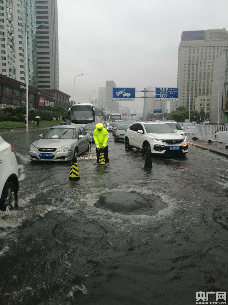 天津交警密切關注積水情況,防止車輛誤入發生危險。(央廣網發 劉媛 攝)