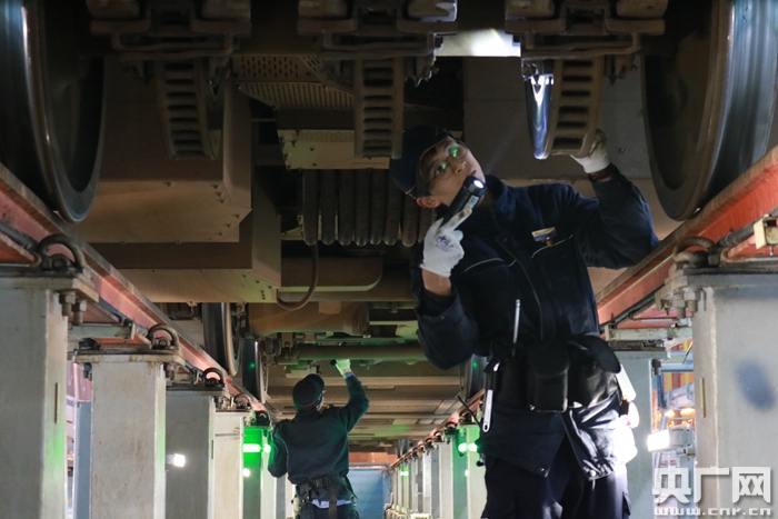 地勤機(jī)械師在檢修“紅眼動車”(央廣網(wǎng)發(fā) 通訊員李國建 攝)