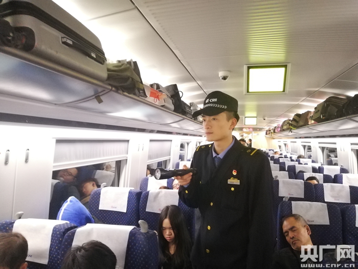 隨車機(jī)械師在“紅眼動車”上巡視(央廣網(wǎng)發(fā) 通訊員李國建 攝)