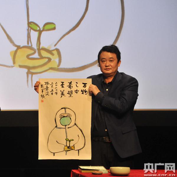“小林老師”在通氣會現場創作漫畫致敬一線醫護人員。(央廣網發 通訊員胡霜月 攝)