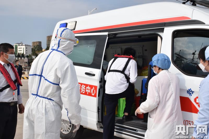 發(fā)熱病員轉(zhuǎn)移至救護(hù)車(chē)(央廣網(wǎng)發(fā) 海事部門(mén)供圖)