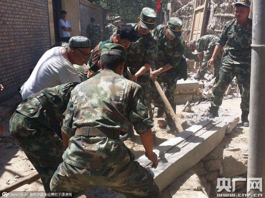2015年7月3日,新疆皮山,和田地區皮山縣發生6.5級地震,武警新疆總隊第五支隊派出兵力緊急馳援,深入該縣受災嚴重的固馬鎮尼向達村,與村民一道清理受損房舍、轉移日用物資、護理受創群眾。